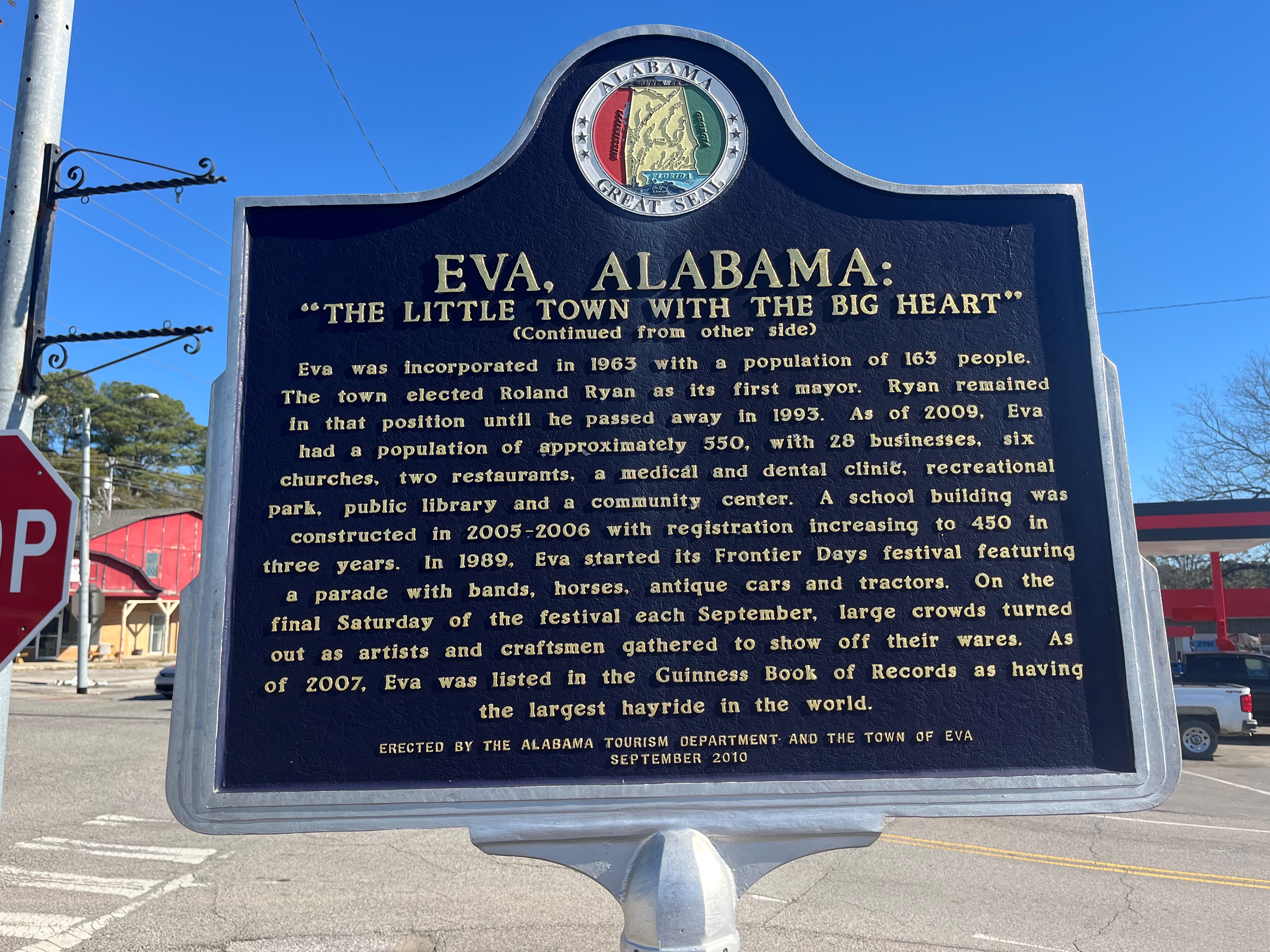 Eva hosts the annual Frontier Days festival. The week of festivities includes singing, a beauty pageant, cooking and baking contests, and concludes on the last Saturday of September. Large crowds gather for a parade featuring bands, horses, motorcycles, antique cars, and tractors. Craftsmen display their skills, and one of the highlights is the hayride, which was listed in the Guinness Book of Records in 2007 as the world’s largest hayride.